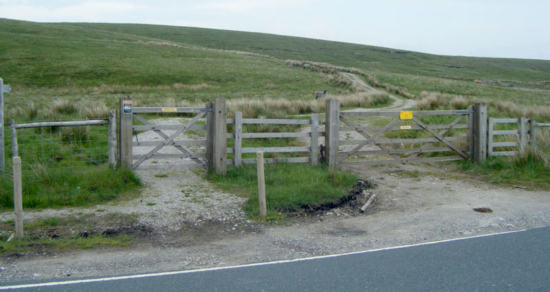At the top of the brow, the track starts to bend to the left, returning to an easterly direction, and immediately past a little breeze block hut with corrugated roof on the right hand side, the track starts to bend to the left in a north easterly direction, and becomes a steady, meandering, uphill ascent, passing over a stream via a ford. Further on, the track again crosses a stream, this time over a culvert, and a dry stone wall comes into view on the left hand side. This wall and the track eventually converge at a 5'wide 5 barred gate, known as Gavel Gap, on which is a sign for the Pennine Bridleway. | |