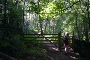 carried straight on at the junction of paths, cut a corner, and avoided the next section of road walking). Turn right and walk along the A625. Follow the road for approx. 700 yards, then take the clear track through a gate on the left. |